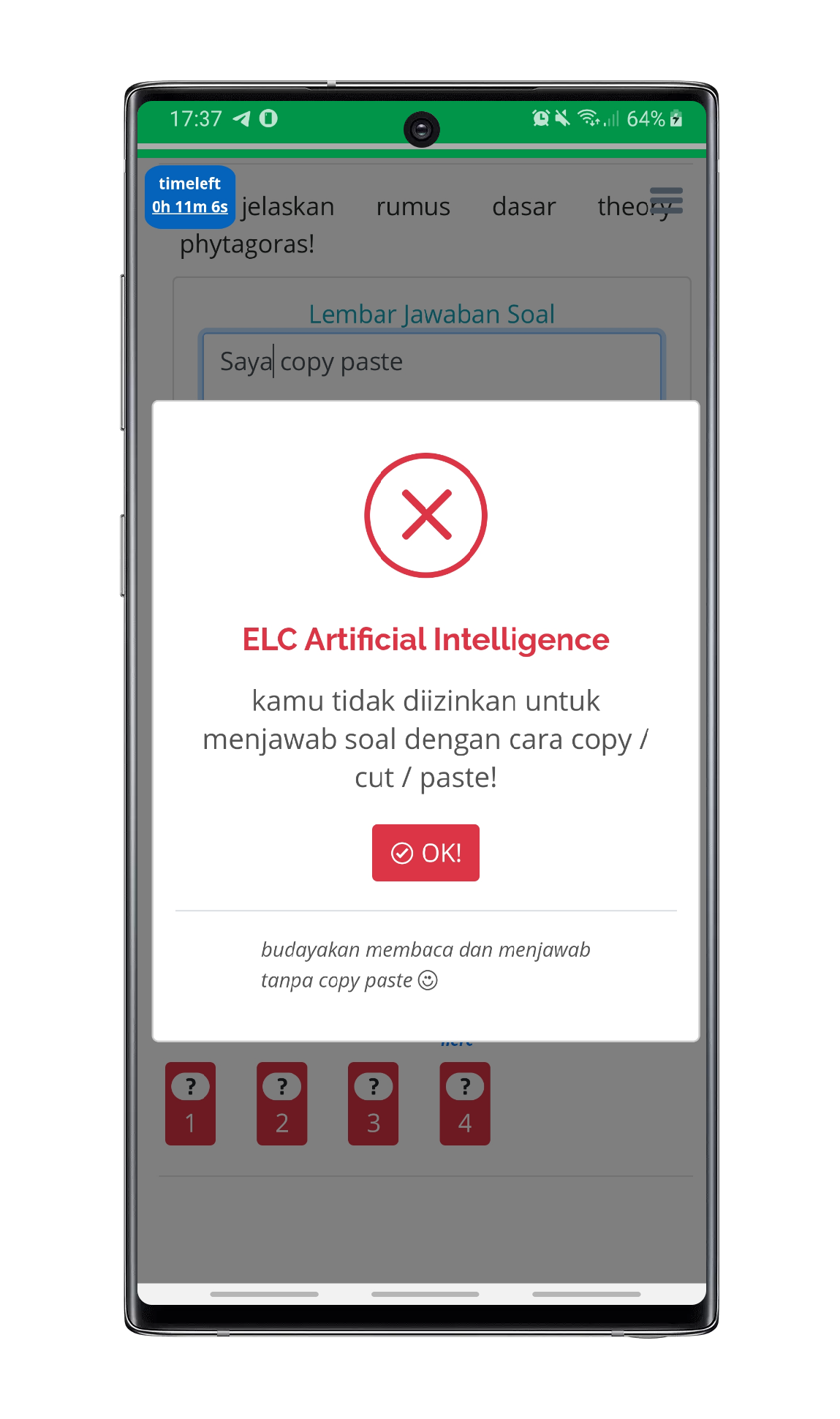 ELC akan mendeteksi adanya command copy paste dan cut yang dilakukan oleh siswa, dan otomatis akan menolak dan membatalkan copy paste tersebut, maka dari itu siswa harus mengetik jawabannya langsung. diharapkan dengan adanya menjawab tanpa copy paste dalam menjawab soal essai, siswa tersebut minimal membaca 2 x, ketika mengetik dan ketika membaca apa yang akan diketik